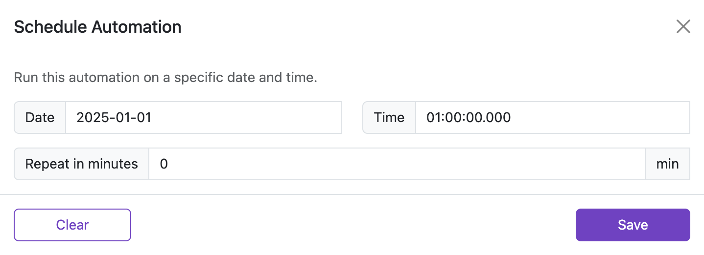 Schedule an automation to run automatically on a specific date and time, with an optional repeat interval in minutes.