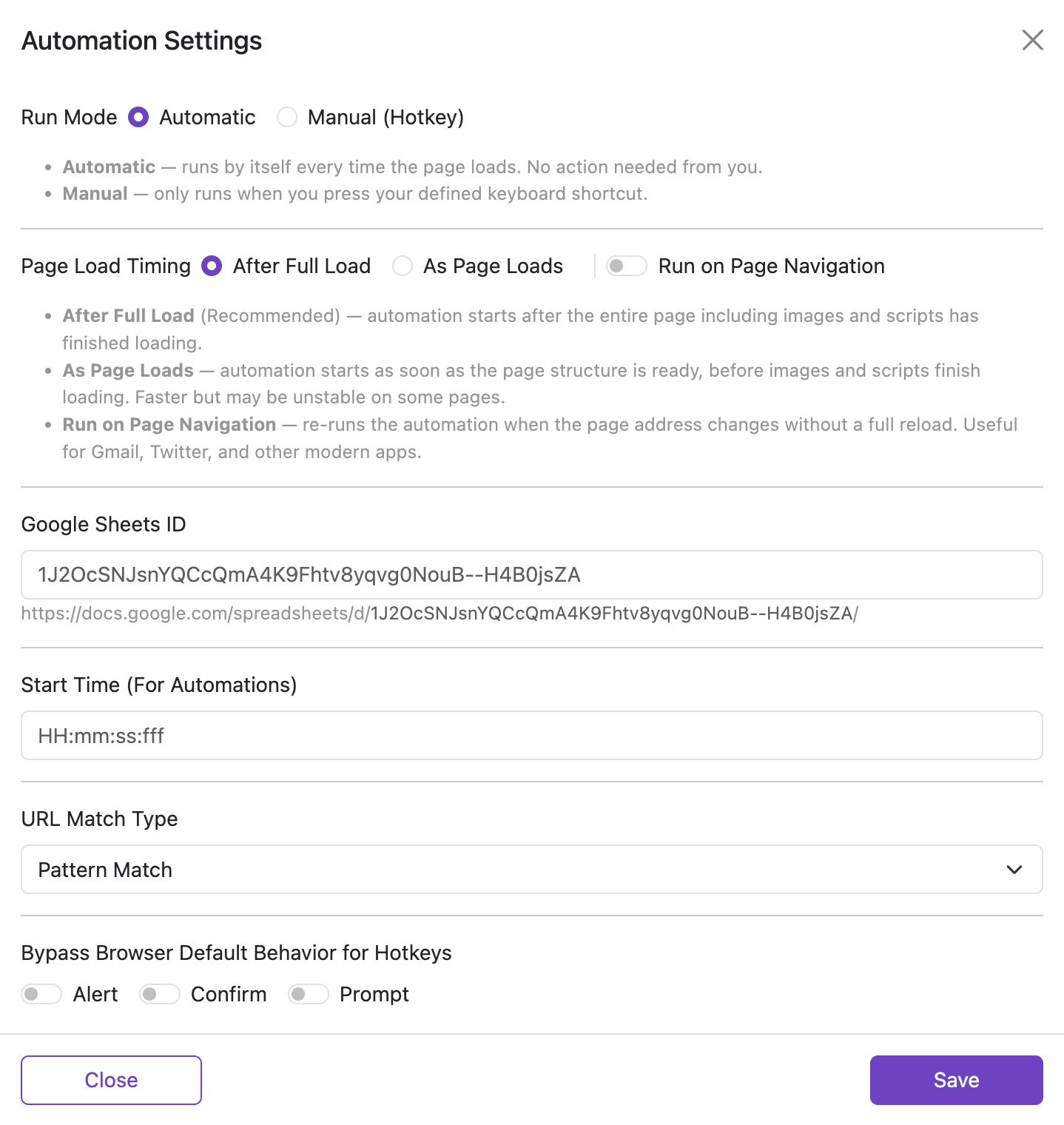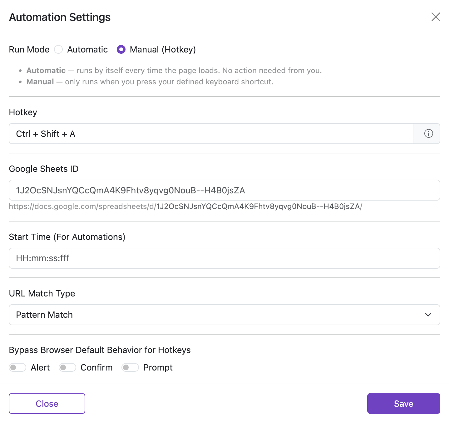 Control whether the extension should bypass the browser's native alert, confirm, and prompt dialogs when an automation is started with a hotkey.
