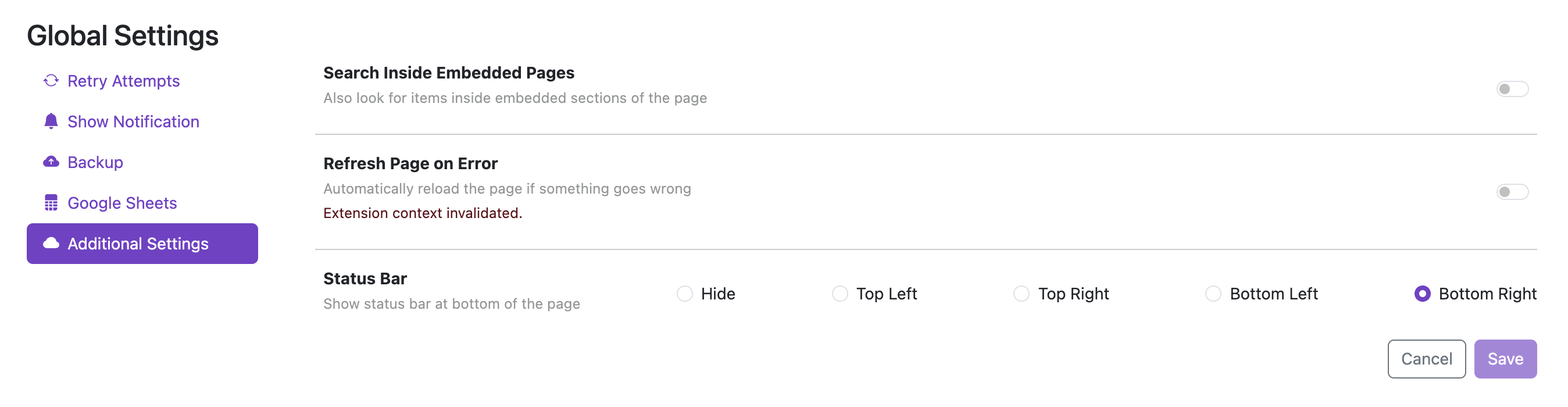 This screen is organized around reusable behaviors such as notifications, retry defaults, backups, Google Sheets, embedded page checks, and page reload behavior.