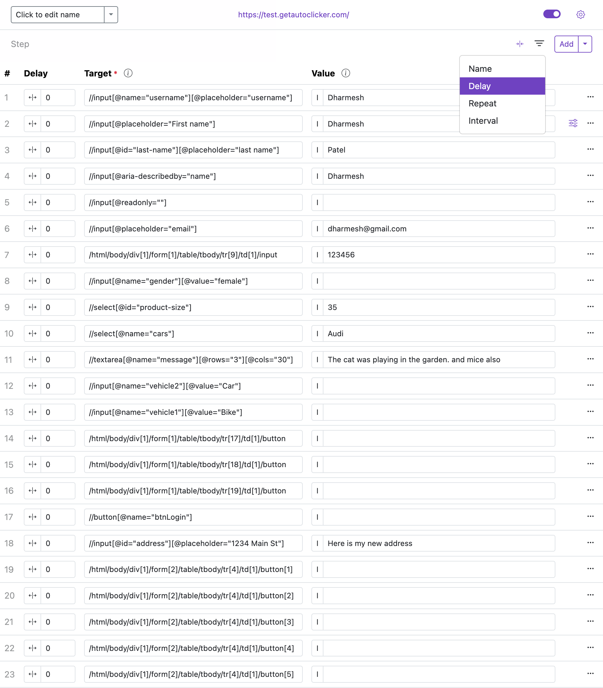 Use the Columns Filter to toggle visibility of optional step columns. This helps keep the table focused while you edit. Hiding a column does not disable the feature; it only changes what is visible.
