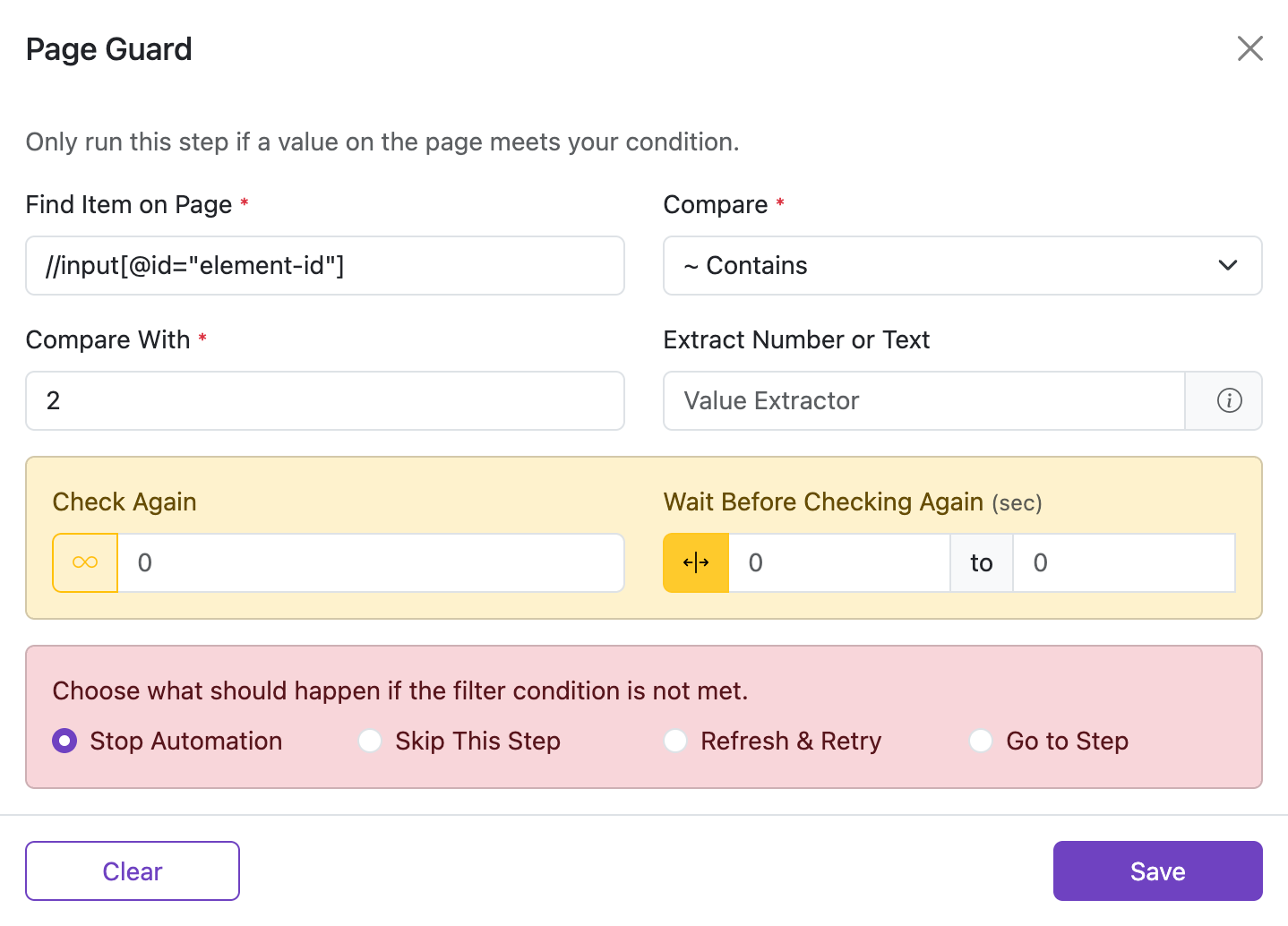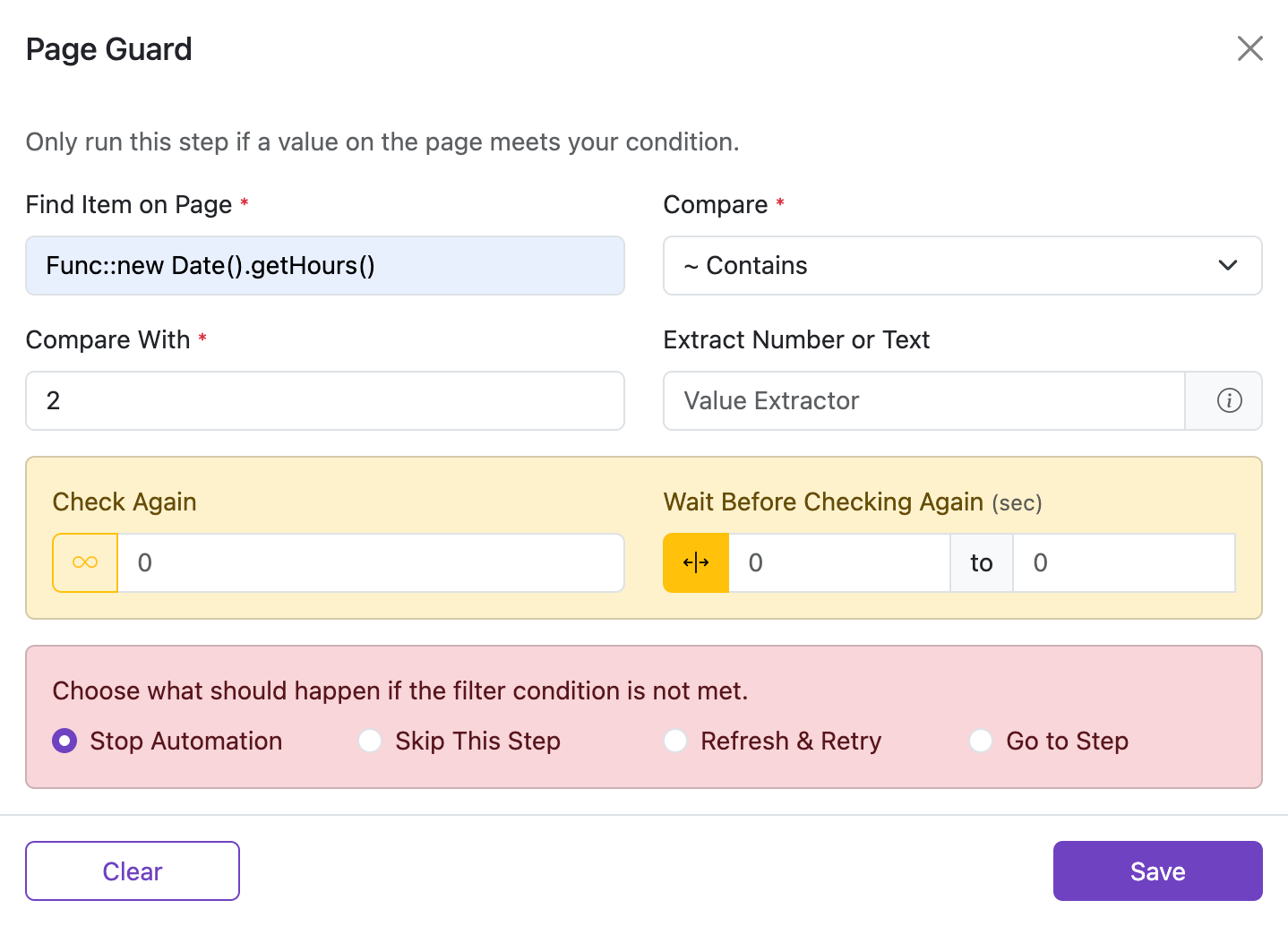 Page Guard checks the page before a step executes. You can read text or attributes from any element, evaluate browser values like the current time or URL, compare them against your criteria, and decide whether to proceed.