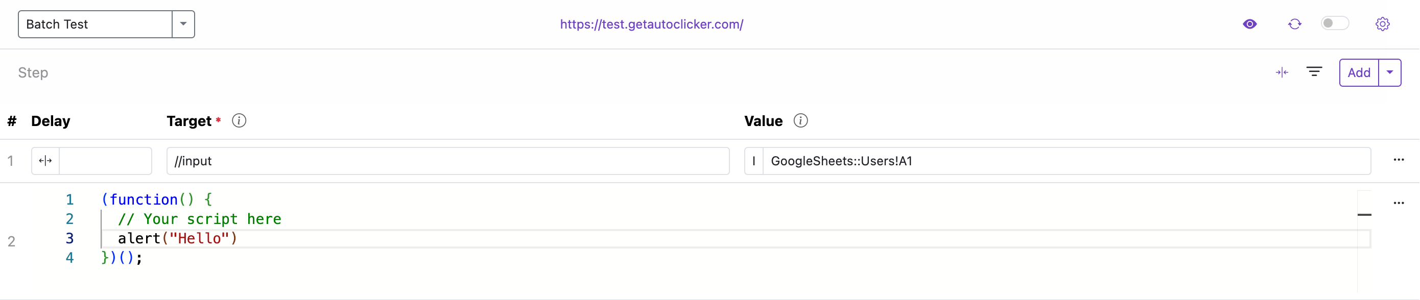A Userscript lets you run your own JavaScript as a first‑class Step. It can replace a step’s Name, Init Wait, Repeat, and Repeat Interval fields with code‑driven logic.